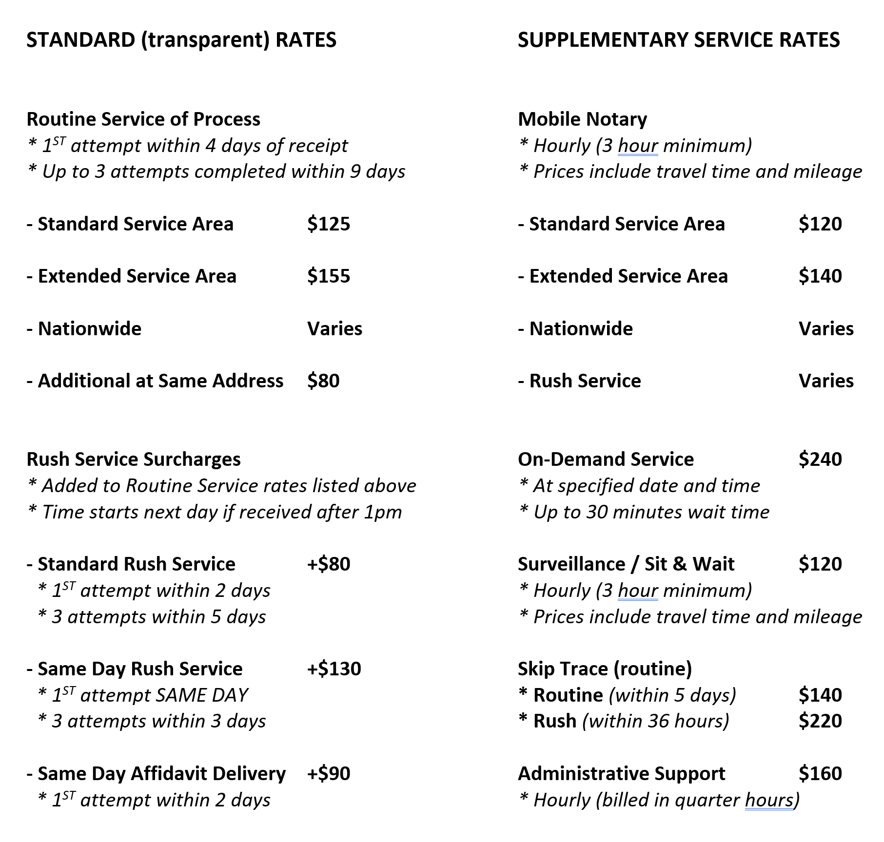 * All prices for service of process include attempts to serve one (1) individual at one (1) address (any additional recipients and/or additional addresses are billed separately)